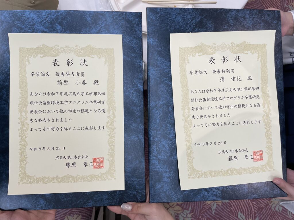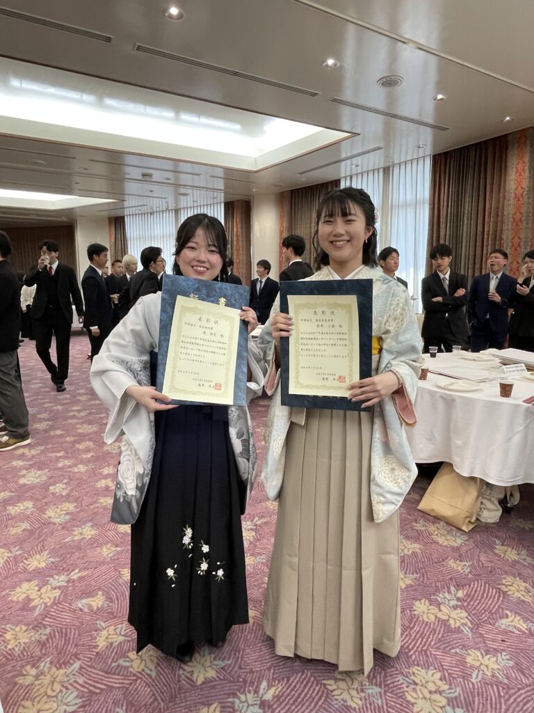 前原さんは卒業論文優秀発表者賞(40名中,教員による評価で上位3名が受賞),蒲さんは卒業論文発表特別賞(優秀発表者賞受賞者を除く37名中,3年生による評価で上位3名が受賞)をそれぞれ受賞しました.