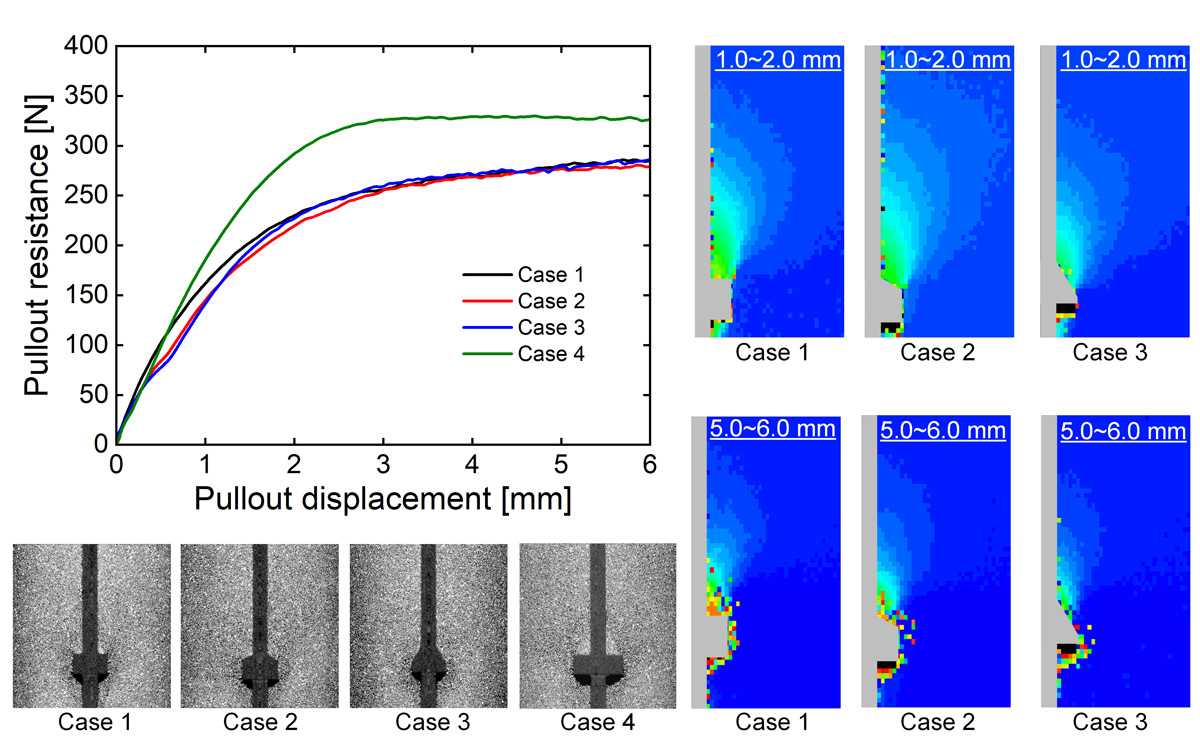 補強土壁は,地中に敷設された補強材の引抜き抵抗力により高い耐震性を発揮する構造物であり,高速道路やアンダーパスにおいて多くの施工実績があります.しかし,既設の補強土壁の中には,多数の降雨や地震の履歴を受けてきたものも存在し,将来的に補強材の引き抜けや転倒などの変状が生じる可能性があります.このため,補強材単体の引抜き抵抗性能評価をはじめ,降雨・地震の複合災害に対する既設補強土壁の長寿命化が重要です.本研究では,補強材と土の相互作用を土粒子スケールで可視化・定量化する基礎的検討と,重力場振動台実験による補強土壁の動的挙動の照査を組み合わせ,ミクロからマクロにわたる多角的アプローチによりこれらの課題解決を目指します.
