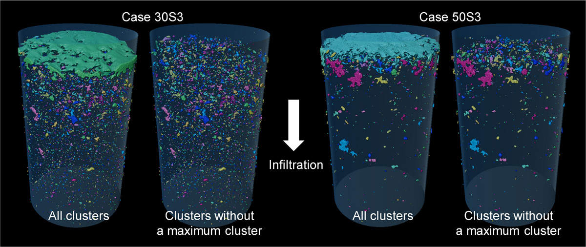 土粒子の間隙に水と空気が混在して存在する状態を不飽和土と呼びます.乾燥土や飽和土と大きく異なる点は,水の表面張力と土粒子の親水性に起因する毛管力が,土中の液架橋やバルク水に作用し,土粒子間の結合力を高めることです.したがって,不飽和土のマクロな力学応答を正しく解釈し,モデル化するためには,保水性の変化,間隙水の存在形態の変化,毛管力の寄与の変化といったミクロな特性を把握することが重要です.本研究では,X線マイクロCTと画像解析を組み合わせた実験と,個別要素法(DEM)による数値解析を併用し,ミクロな視点から不飽和土の力学挙動の全貌解明を目指します.